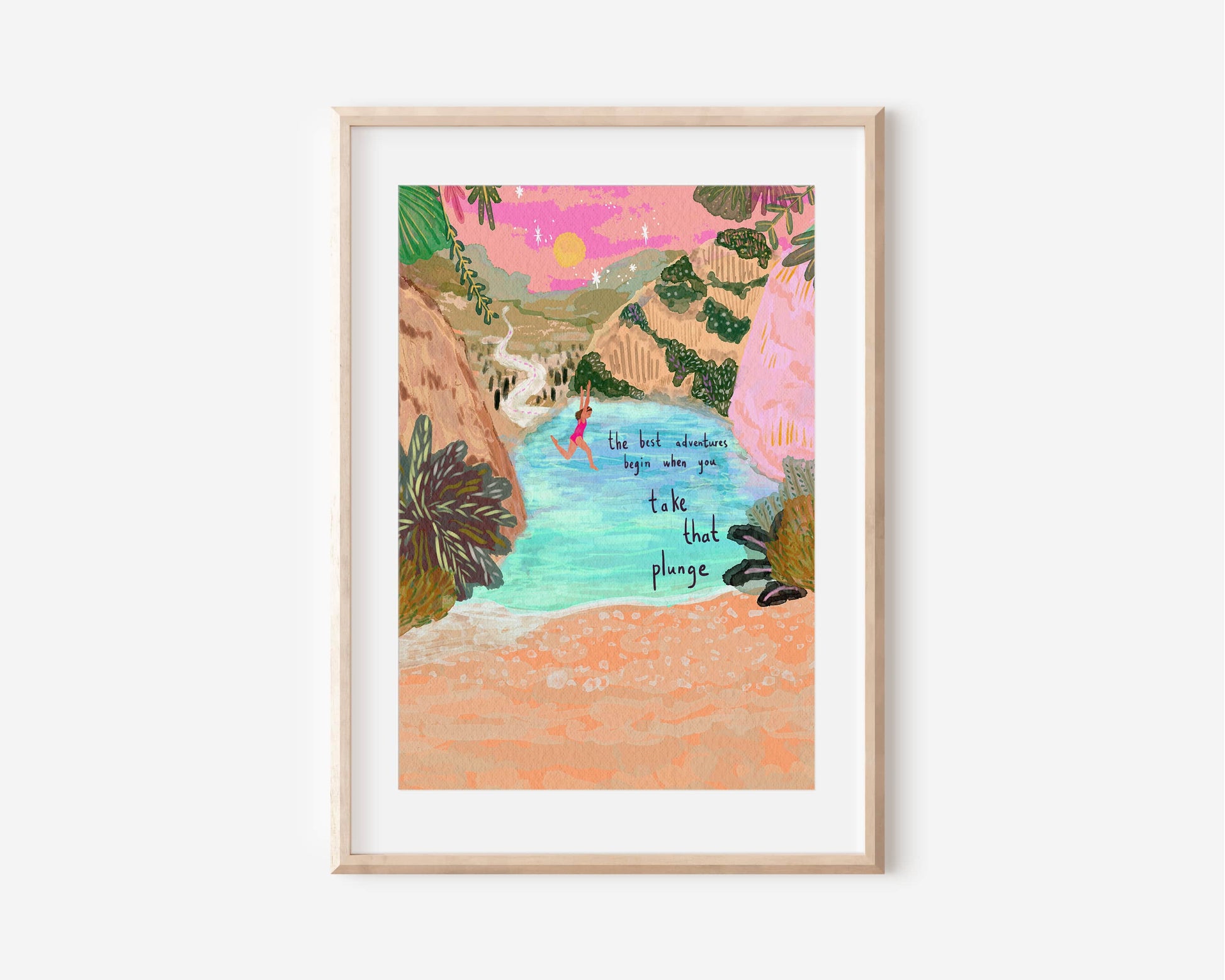 Take a leap of faith and watch the magic unfold. Dive into the unknown with this beautiful art print as your reminder to embrace new adventures. Hang it on your wall for those good vibes that inspire you to keep exploring. Remember, the best adventures begin when you take that plunge!